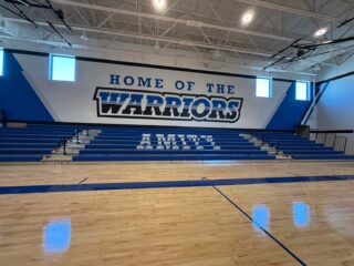 The gym looks fantastic. The new floor is polished and painted with the school’s logo and branding. The walls are complete with murals, lights are on, and the bleachers are fully installed.